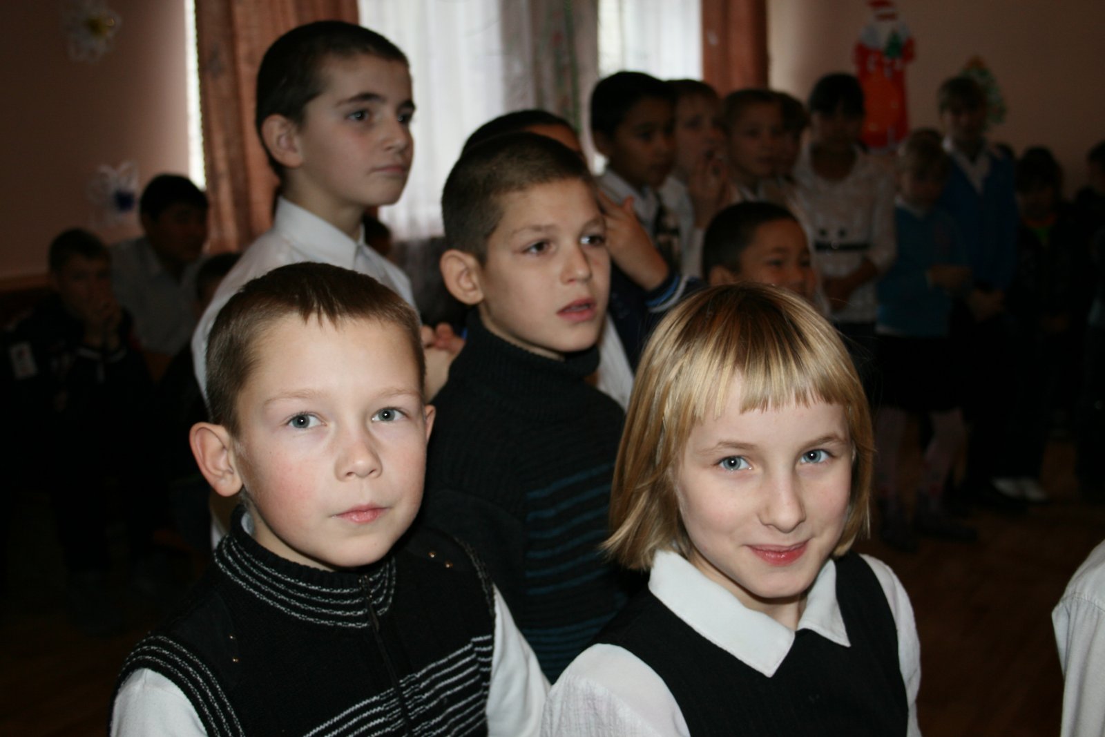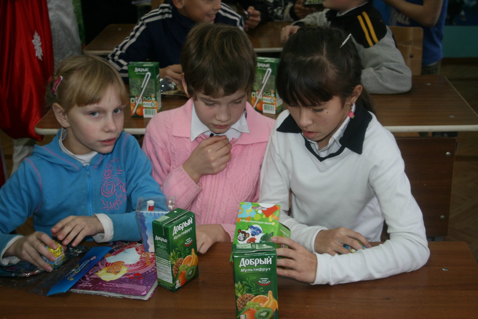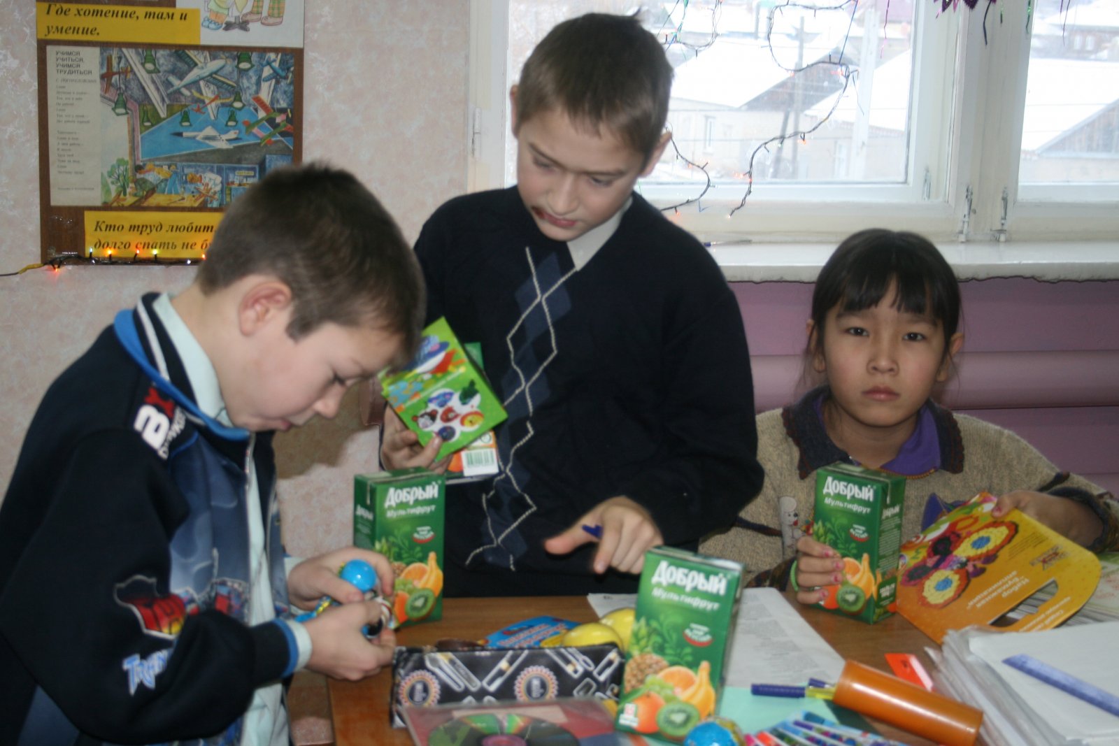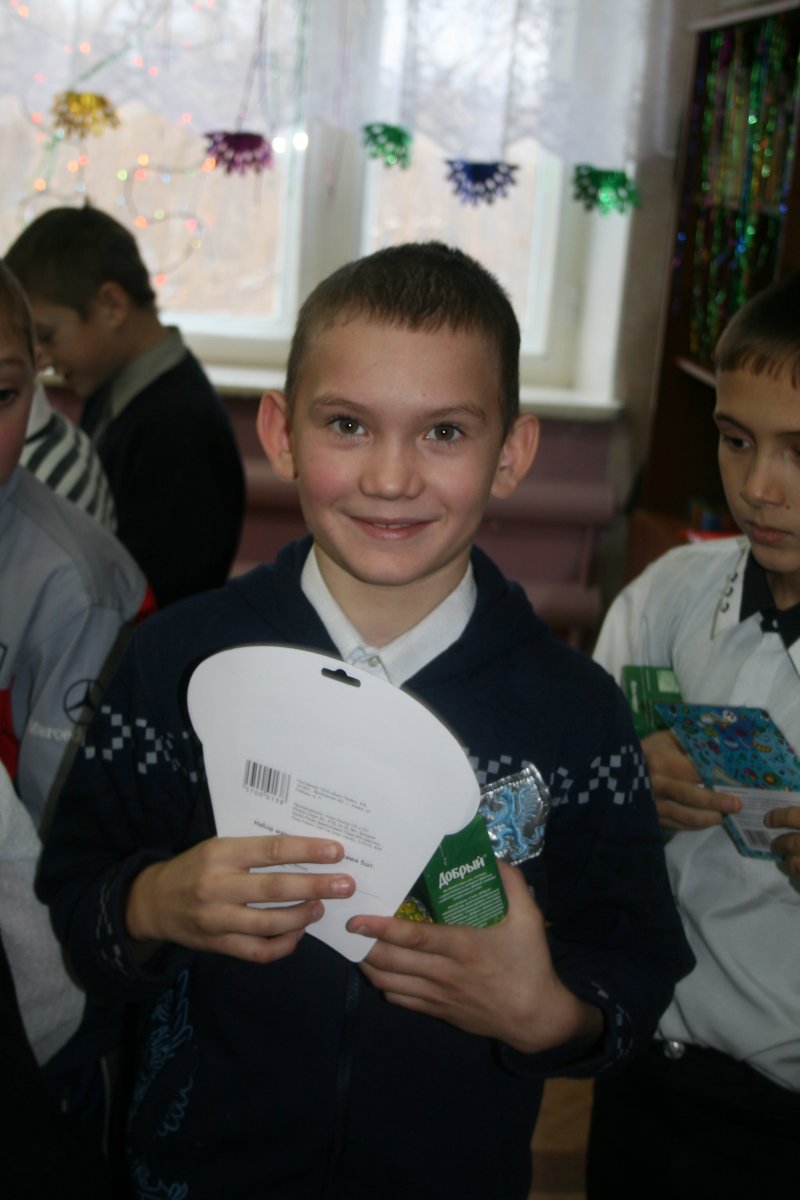 Ну, и конечно, какой же праздник без новогодних подарков! Каждый ребенок школы-интерната получил целую охапку сюрпризов: игрушку, фруктовый сок, шоколадное яйцо с сюрпризом. На праздничный обед ребят также ждали свежеприготовленные торты, фрукты и сладости. Кроме того, в торжественной обстановке школе-интернату был вручен сертификат на строительные материалы, компьютер, многофункциональное устройство 3-в-1, книжки, игрушки, одежду и другие подарки.